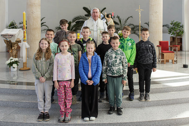 Děti z Fryštáku, které včera poprvé přistoupily k prvnímu svatému přijímání, přijely spolu s rodiči do Starého Města. Po prohlídce Památníku Velké Moravy prožily v kostele Svatého Ducha mši svatou, kterou pro ně slavil P. Josef Brtník SDB.
