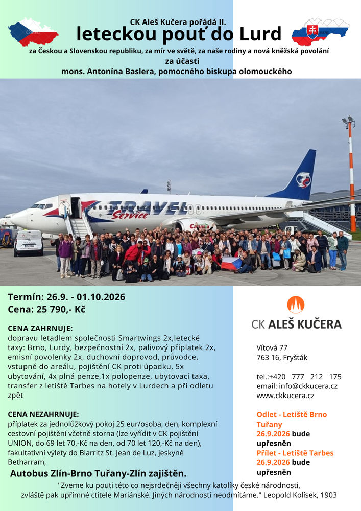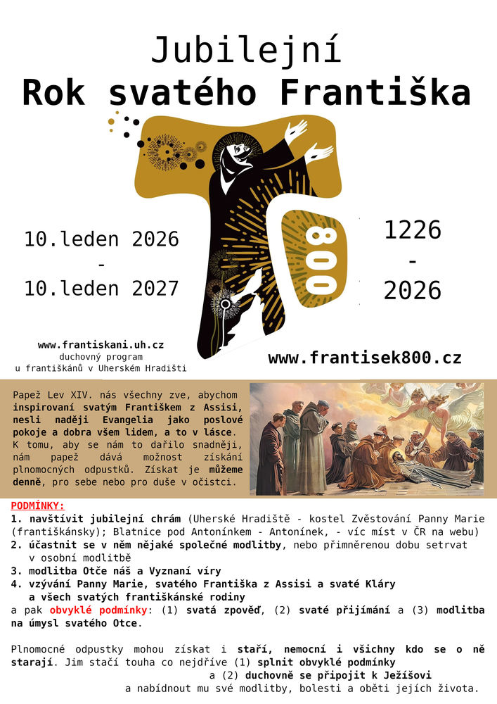 Papež Lev XIV. nás zve, abychom insporováni svatým Františkem z Assisi nesli naději Evangelia jako poslové pokoje a dobra všem lidem, a to v lásce. K tomu, aby se nám to dařilo snadněji, nám papež dává možnost získání plnomocných odpustků. Získat je můžeme denně, pro sebe nebo pro duše v očistci. Více informací na plakátku nebo na webu.