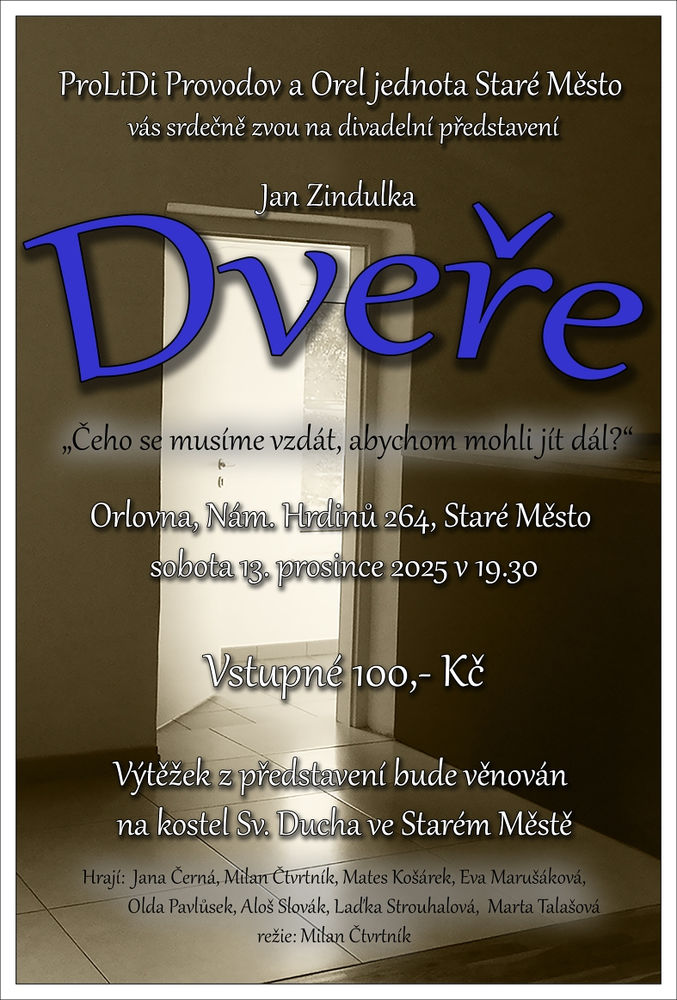 ProLiDi Provodov a Orel jednota Staré Město Vás srdečně zvou dne 13.12.2025 na Orlovnu na divadelní představení Dveře od Jana Zindulky. Bližší informace naleznete na plakátku.